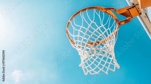 Ball scoring in basketball, clear sky behind the net.