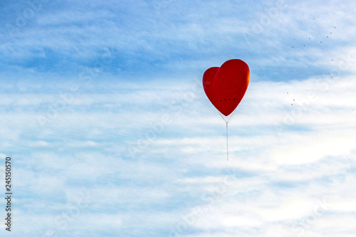 Balloon in the shape of heart is flying among the clouds, copy space for Valentine's Day, Mother's Day or Women's Day.