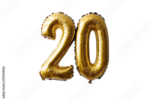 Balloon in the shape of the number 20. Gold colored balloons. On background transparent