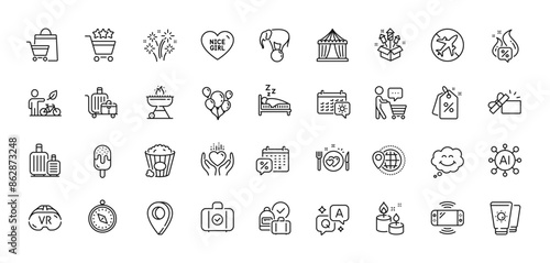 Balloons, Fireworks rocket and Smile line icons pack. AI, Question and Answer, Map pin icons. Airplane mode, World travel, Baggage cart web icon. Vector