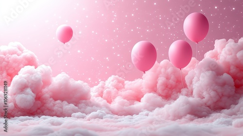 Balloons Floating in Pink Clouds balloons floating among fluffy pink clouds, creating a dreamy and romantic scene against a blue sky