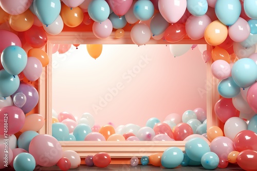 Balloons of all dimensions cluster around an empty birthday frame in crystal-clear resolution, setting the stage for a photographic celebration filled with cheer.