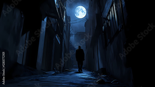 Bandit lurking in shadowy alley, medium shot, moonlit, suspenseful atmosphere, thriller style. Eerie Moonlit Alleyway. Illustration