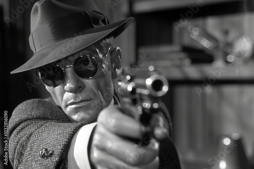 Bandit, monochromatic, close-up image of intense man in suit and fedora aiming revolver directly at viewer. classic film noir style, with sharp contrasts and tense atmosphere of crime and suspense.