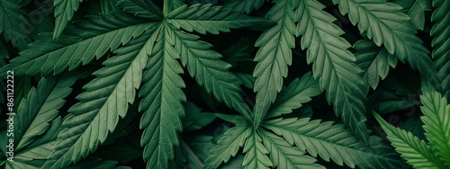 Banner background - Close-up view of lush green cannabis leaves pattern, natural hemp texture, dark green, moody color. Organic health, wellness benefits of cannabis plant,