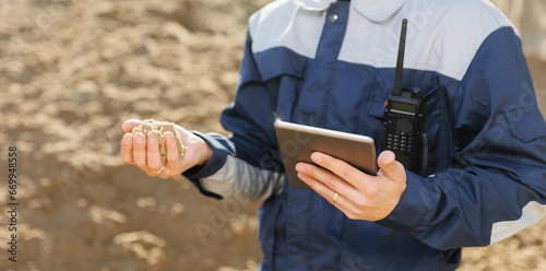 Banner control quality of sand on quarry industrial open pit mine or cement plant. Worker of industry lab use computer tablet