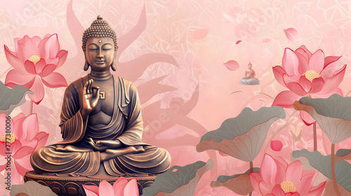 banner for Vesak day with copy space, on a pink background buddha statue and lotuses with place for text
