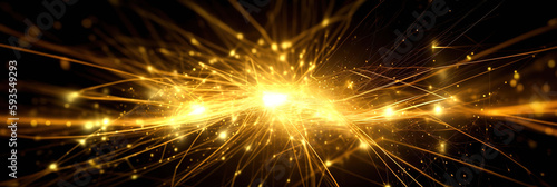 Banner gold tech futuristic web, science and technology, golden glowing rays with flickering particles, lines, dots, glitter effect on dark background. generative ai.