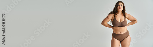 banner of curvy young woman in underwear with brown hair posing with hands on grey background