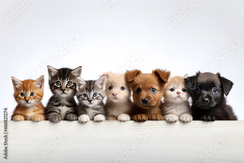 Banner of puppies and kittens in row, hanging its paws at blank banner.