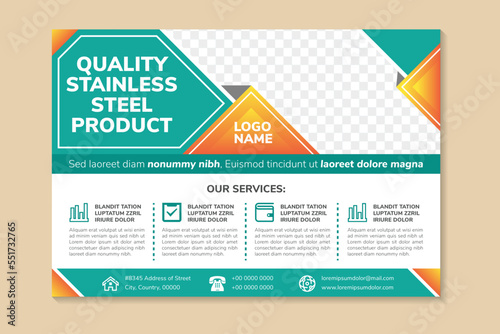 banner template design for promotion of quality stainless steel product. horizontal layout with square space for photo collage in diagonal. yellow gradient and green elements on white background.