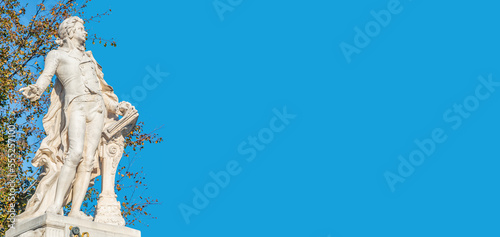 Banner with Mozart monument in historical downtown of Vienna, Austria at sunny day, blue sky with copy space for text, details