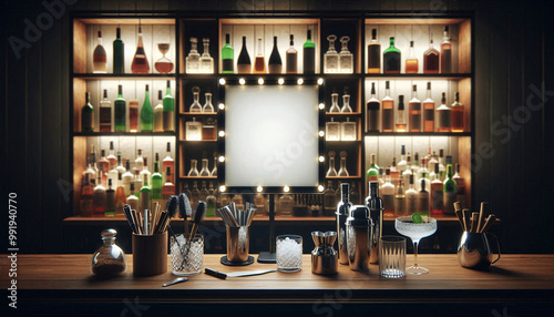Bar Counter with Assorted Bottles and Blank Menu Board