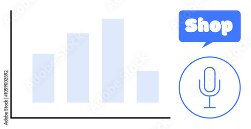 Bar graph with four bars of varying height on left, speech bubble with word Shop on right, and a microphone icon below speech bubble Ideal for business, marketing, technology, retail, analytics