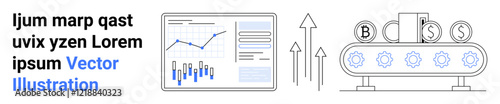 Bar graph with line chart, vertical arrows, conveyor belt with currency symbols, cogwheels, and a credit card. Ideal for finance, analytics, automation, economics, data analysis, technology