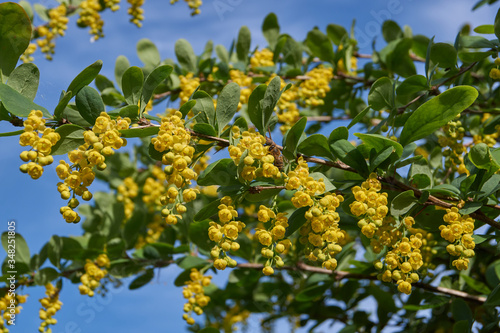Barberry ordinary (lat. Berberis vulgaris) blooms - a shrub, a species of the genus Barberry (Berberis) of the family Barberry (Berberidaceae).