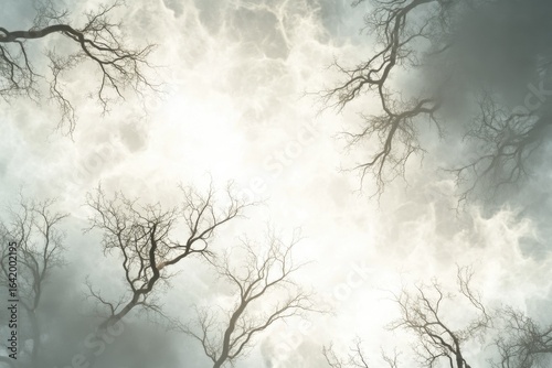 Bare branches of trees reach towards a cloudy, hazy sky, creating an eerie, atmospheric scene.