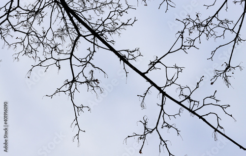 Bare branches of trees without leaves against the sky. Winter sky with branches.
