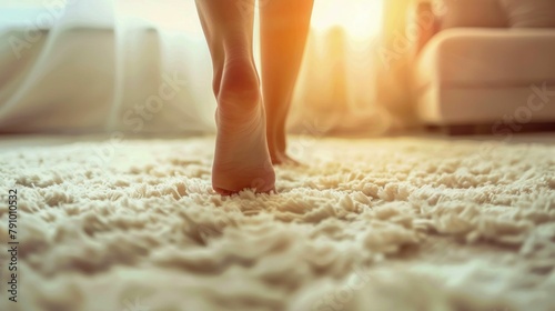 Bare Feet Walking on a Fluffy Carpet in Sunlit Room. Generative ai