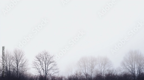 Bare tree branches emerge from dense fog, creating a haunting and serene winter landscape.
