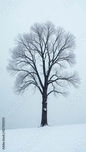 Bare tree with frosty limbs stretching towards the grey sky, isolated, snowflakes, snow