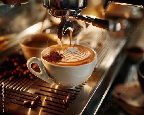 Barista making coffee with latte art, dynamic and inviting, Culinary, Warm tones, Photograph, Coffee culture
