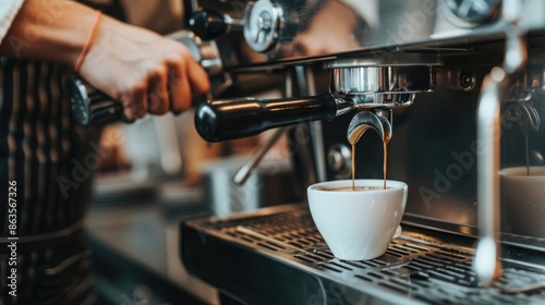 Barista using a coffee maker In a comfortable coffee shop atmosphere,close up, free space.