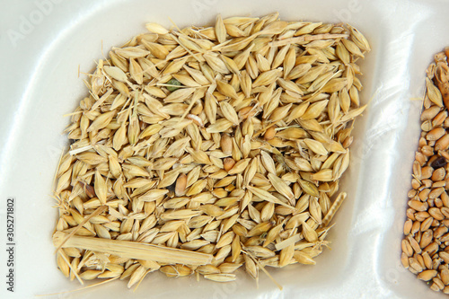 Barley seed close up. Top view. Macro.Malted barley isolated on white plastic plate background with clipping path. Ingredient for brewing beer. Malted barley grains .