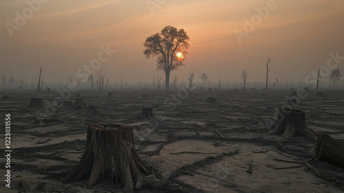 Barren Deforested Landscape with Sunset Over Remaining Tree Stump