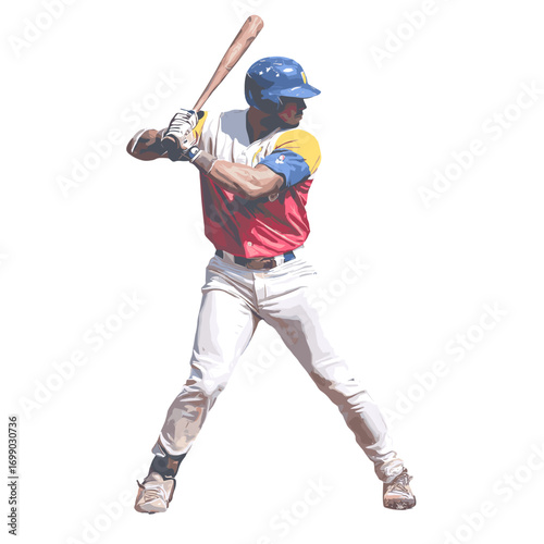 Baseball Player Ready to Strike: An athletic figure, clad in vibrant colors, prepares for a powerful swing, showcasing focus, precision, and dedication in the heart of the game.