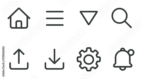 Basic ui icon set. home, menu, triangle, search, upload, download, settings, bell vector icons.
