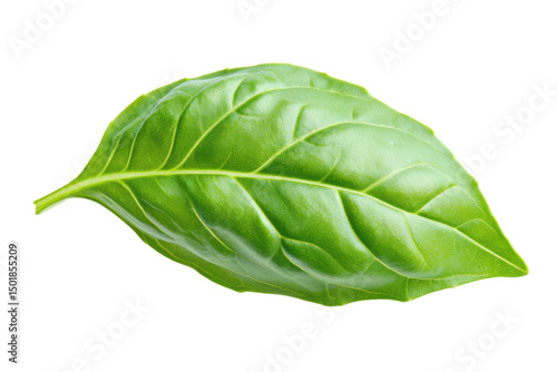 Basil leaf in macro view highlighting its texture and veins against a white background
