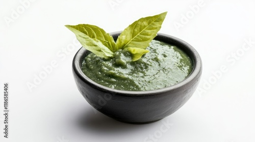 Basil Paste in Black Bowl with Fresh Green Leaves on White Background