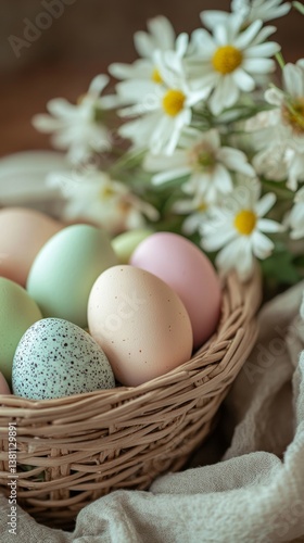 basket with pastel colored easter eggs with beautiful chamomile flowers on white background. ai generated