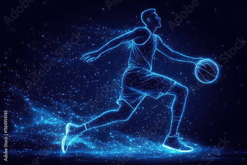 basketball player in action, jumping high to make a slam dunk with energy and precision. The design captures athleticism, power, and the excitement of the game, rendered in a sleek low-poly style with