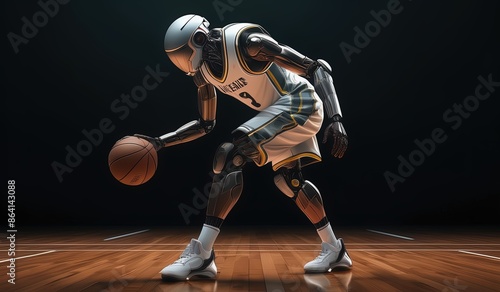 basketball robot player. robot wearing a jersey playing basketball. robot model basketball athlete.