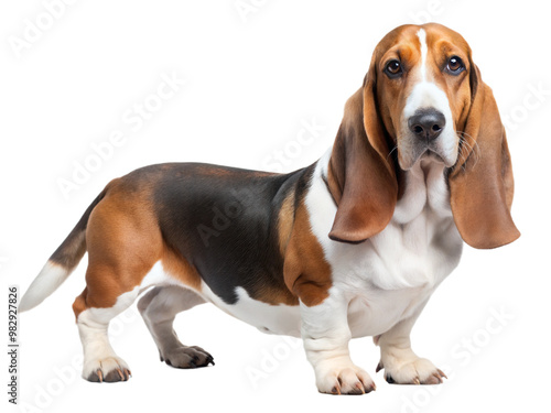 Basset hound dog, standing and looking at camera, isolated on white background