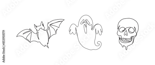 Bat, ghost, skull skeleton continuous one line drawing, single line art element, minimalist sketch line vector illustration, autum and thanksgiving concept