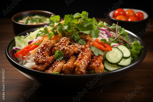 Battered and fried chicken with barbecue flavor topped with ketchup in white bowl on wooden table.
