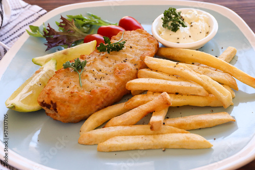 Battered grilled hake fillet and hot chips