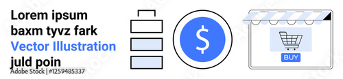 Battery level, dollar sign, and online store interface with a shopping cart button. Ideal for e-commerce, finance, sustainability, budgeting, online trade, digital platforms flat landing page banner
