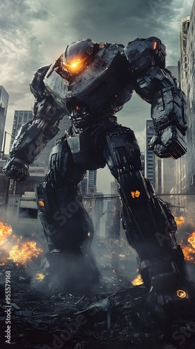 Battle Hardened Mech Pilot in Intense Combat Scenario Against Devastated Urban Backdrop