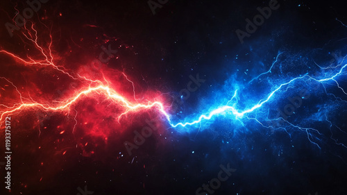 Battle of red and blue lightnings concept backgrpond. The confrontation between red and blue lightning poster. Digital illustration. AI artwork.