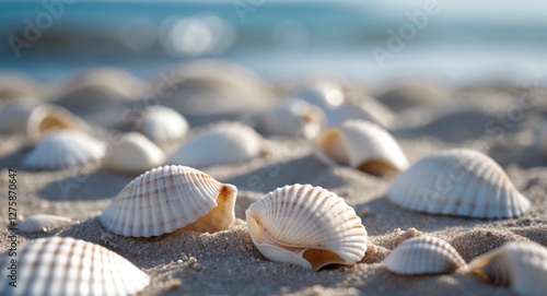 Beach Scene with White Seashells on Soft Sand and Blurred Ocean Background