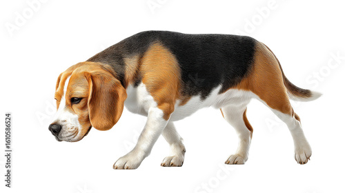 Beagle dog isolated on transparent background walking with focused expression on face