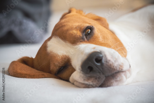 Beagle dog tired lie on couch and resting