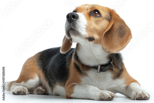 Beagle Puppy Lying Down and Looking Up on White Background, Representing Pet Adoption and Animal Companionship : Generative AI