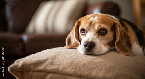 Beagle resting on a cushion, showcasing a calm and relaxed demeanor