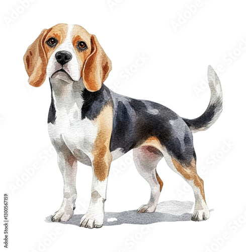 Beagle standing proudly with alert expression and striking coat, perfect for dog lovers and pet enthusiasts in various designs, cut out