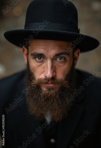 Bearded jewish man, black hat, looks intently, wearing traditional attire against blurred background